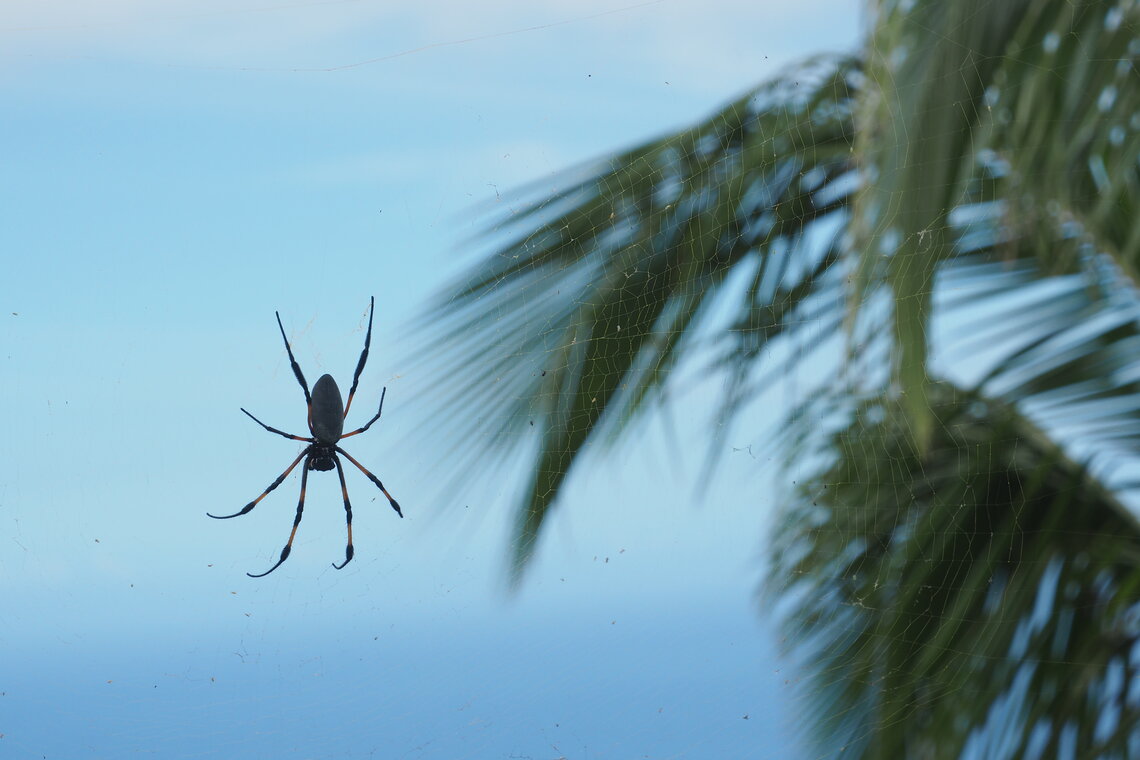Charmante araignée de taille impressionnante, aux belles pattes jaunes et noires, ce fut notre première rencontre animale sur l’île de la Réunion.